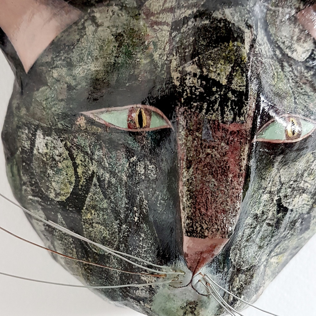 Tête de chat en papier mâché en volume peinte à la main.